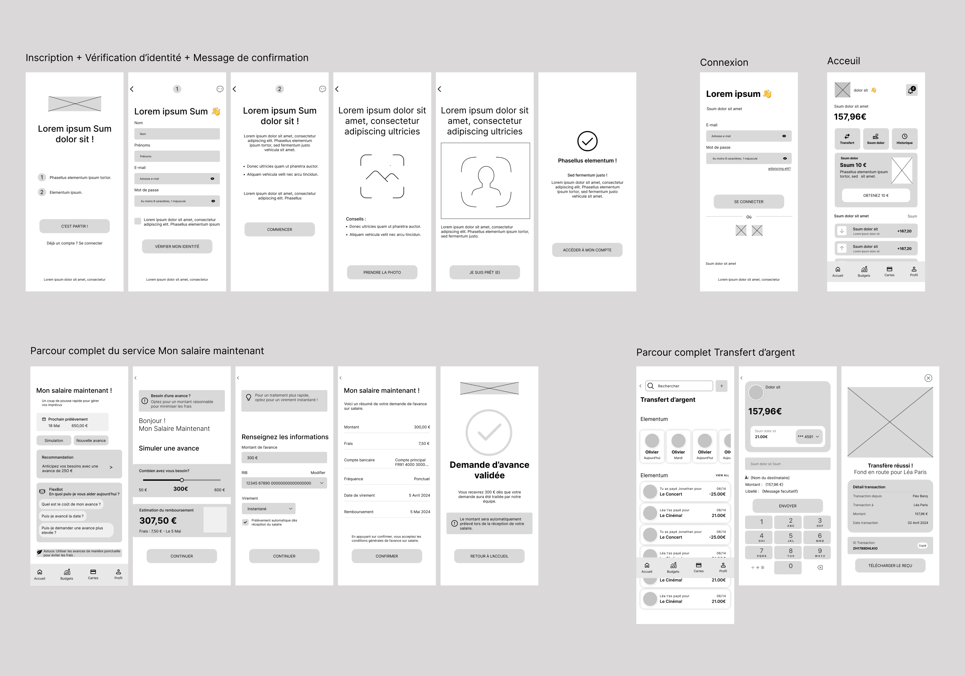 Avant de concevoir Flex Banq, j'ai réfléchi à l'articulation des fonctionnalités pour qu'elles répondent à l'urgence de l'utilisateur sans générer de stress. J'ai défini une navigation où chaque section joue un rôle précis : l'Accueil offre une visibilité instantanée sur le montant disponible, le parcours Demande est isolé pour focaliser l'attention sur la sélection du montant (Slider), et une section Gestion centralise le suivi budgétaire pour rassurer l'utilisateur une fois l'avance obtenue.