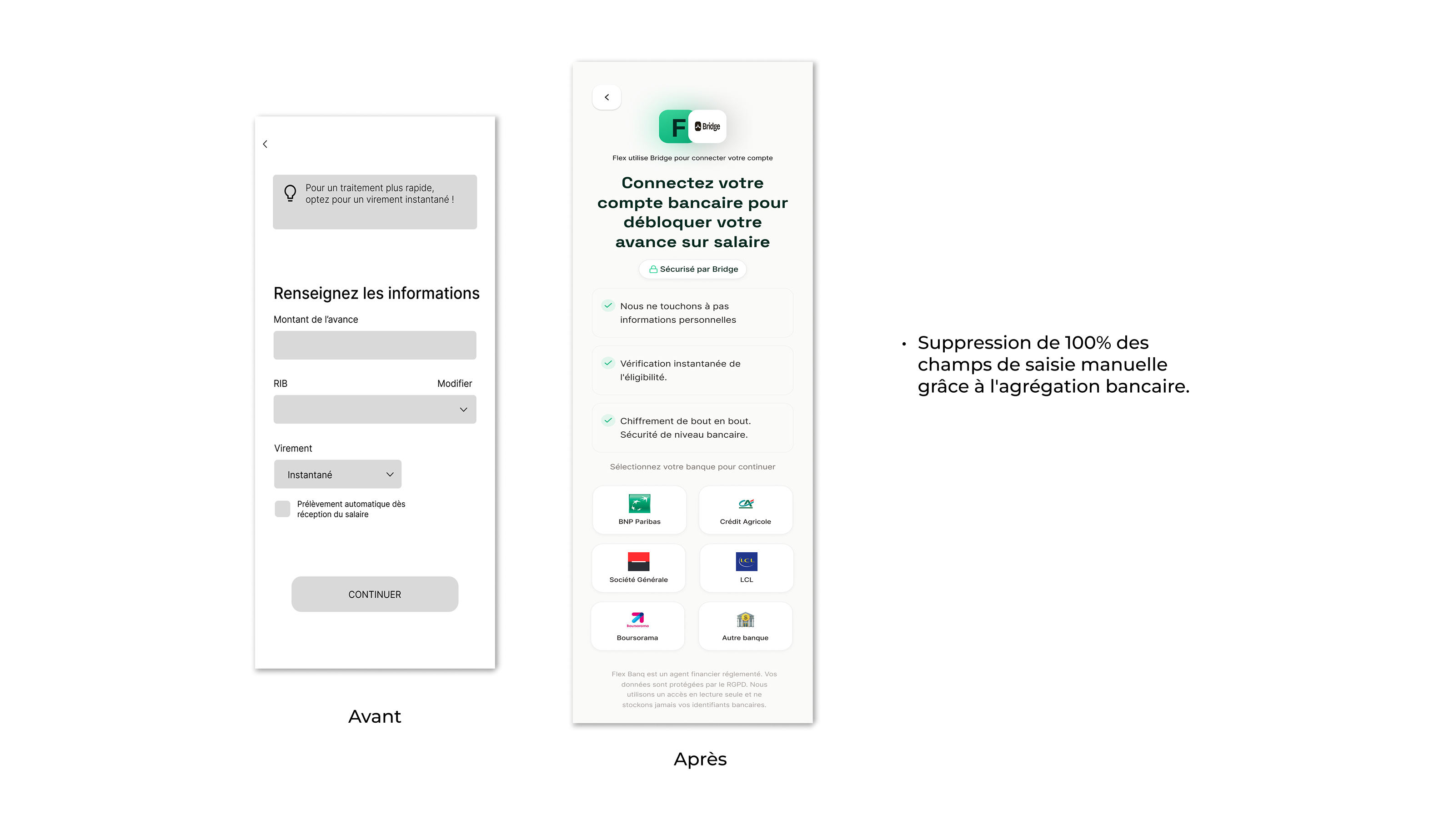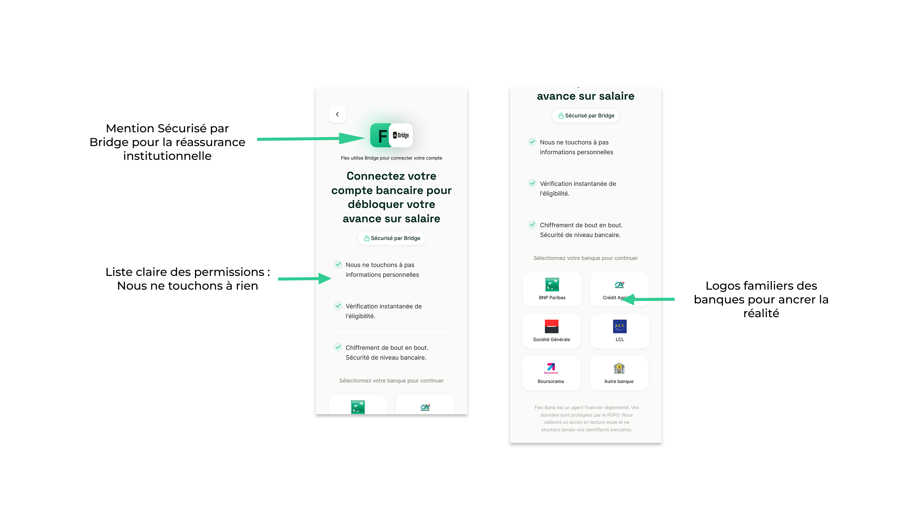 En Fintech, être sécurisé ne suffit pas : il faut le prouver. J'ai utilisé l'intégration explicite de marques tierces Bridge et des feedbacks visuels immédiats pour transformer l'anxiété de la connexion bancaire en un parcours rassurant.