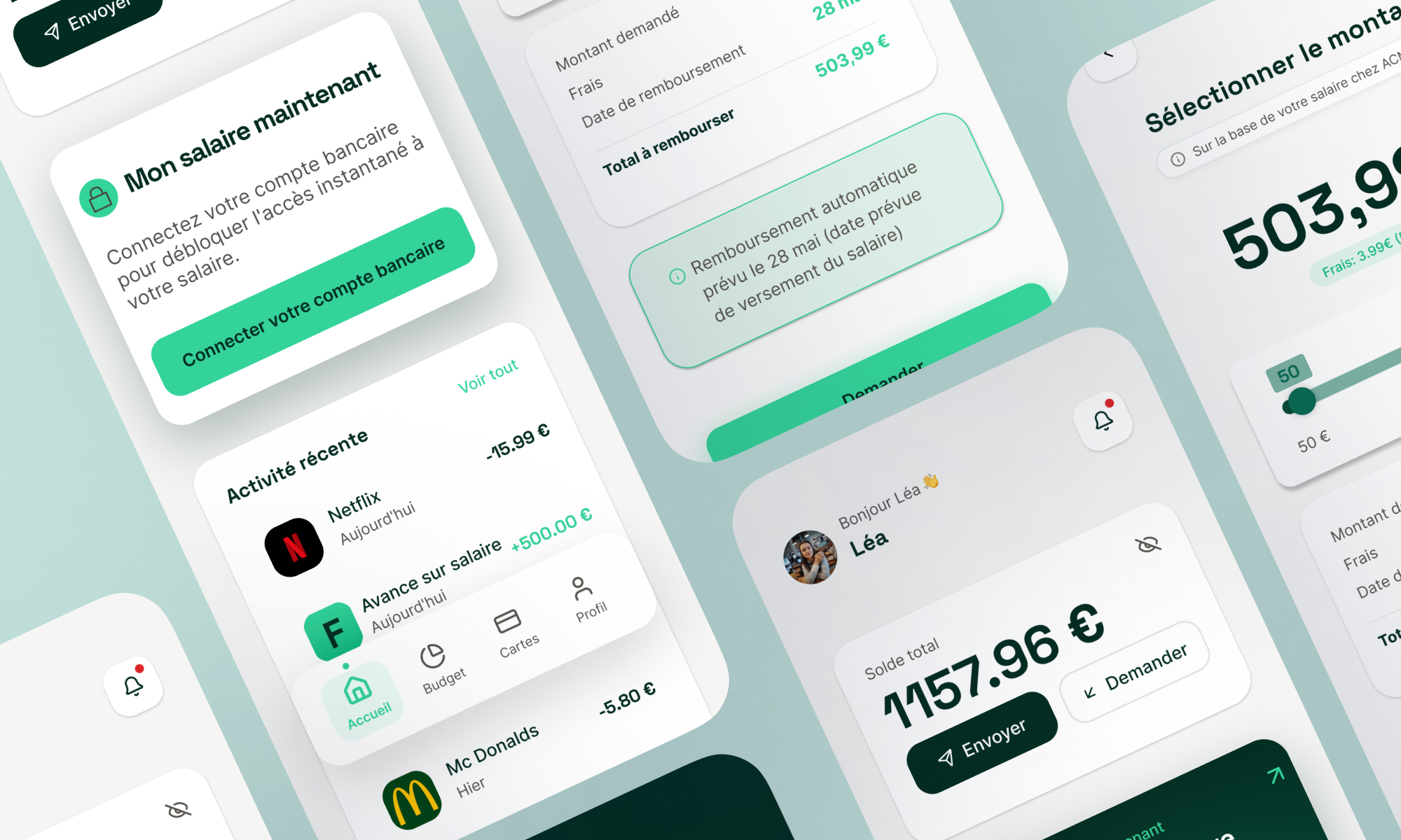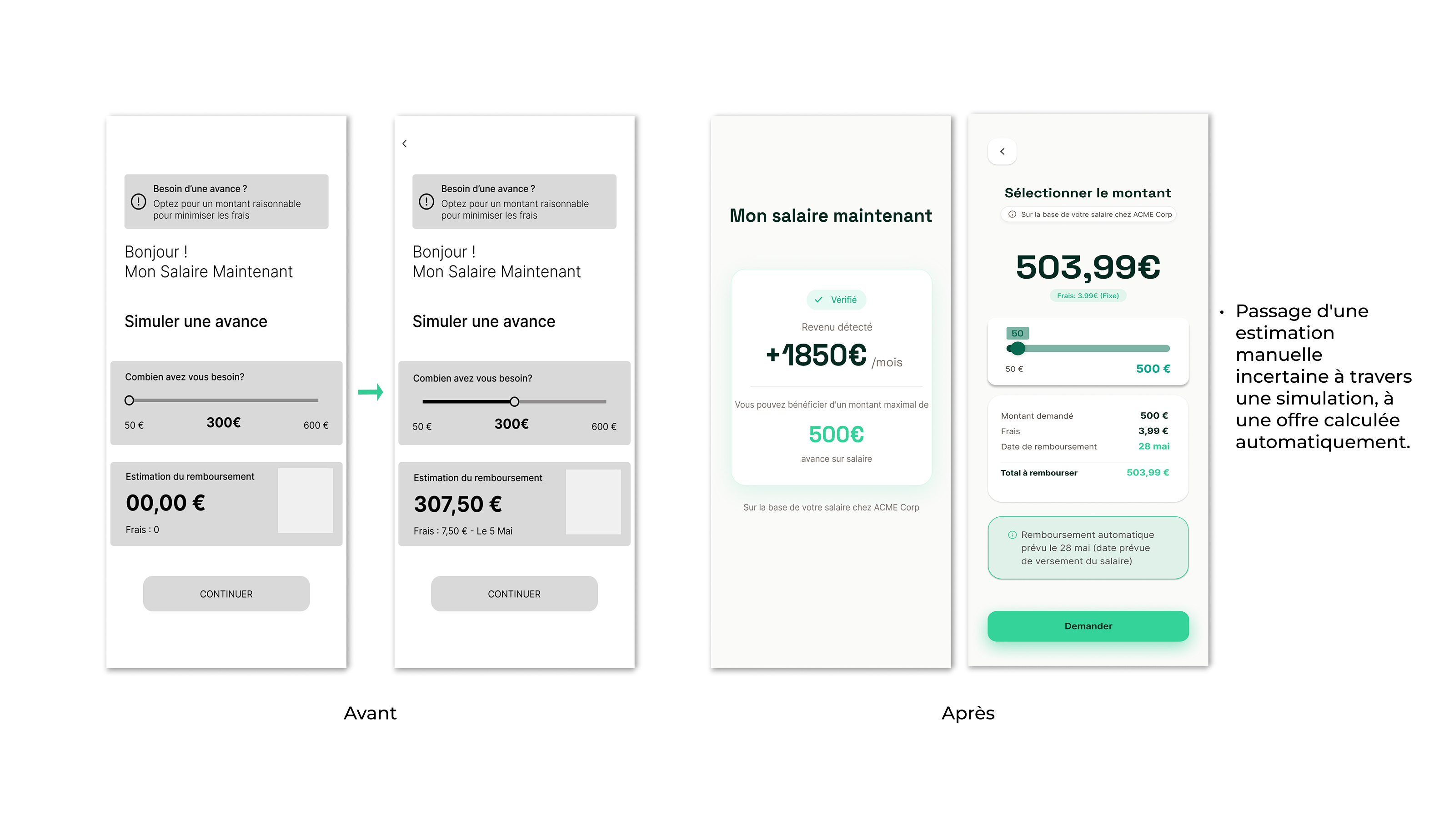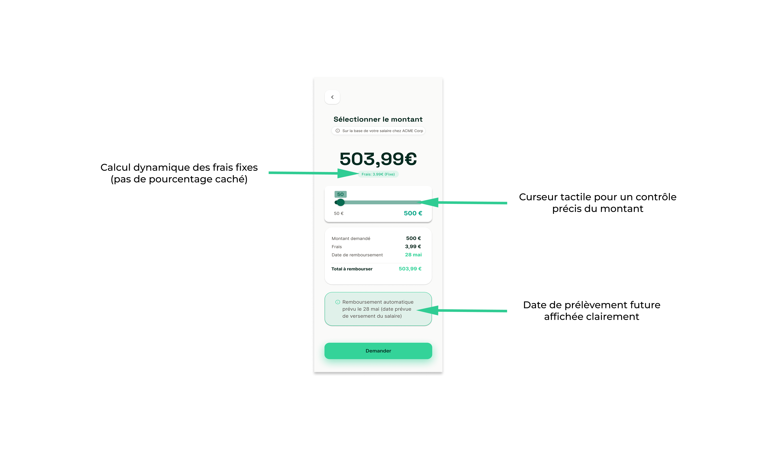 C'est le cœur de l'expérience. L'utilisateur accède à Mon Salaire Maintenant et utilise le curseur interactif pour choisir le montant exact. Les frais et la date de remboursement s'affichent instantanément, garantissant une transparence totale avant validation.