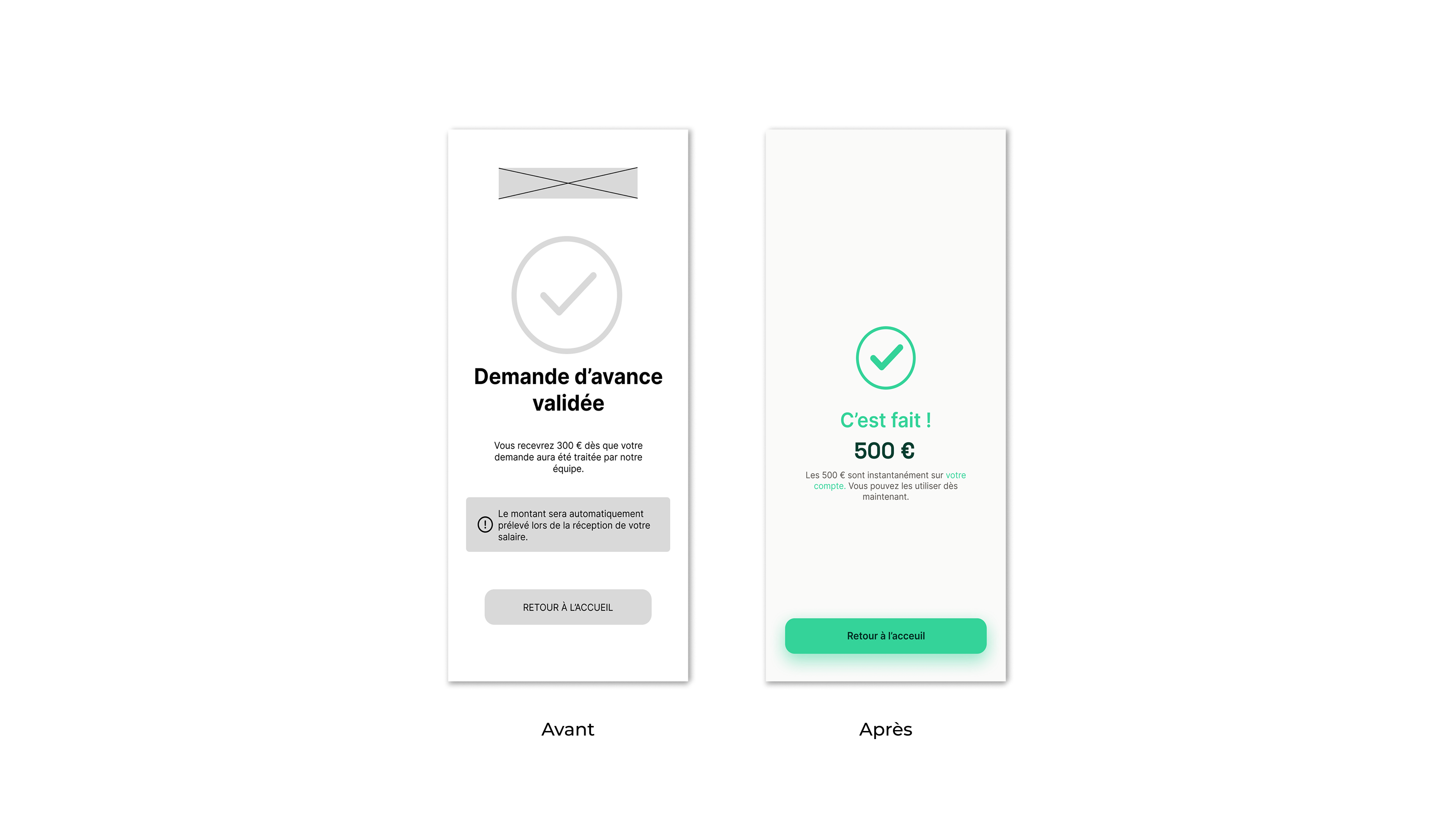 L'ancien écran : Dossier traité par l'équipe suggérait un jugement humain et un délai incertain, brisant la promesse d'instantanéité. Pour remédier à cela, j'ai remplacé cette attente passive par le feedback C'est fait, qui est immédiat.